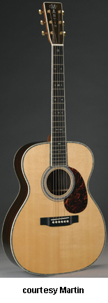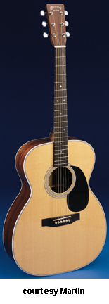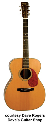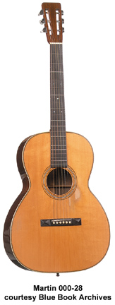 000-28 | - Grand Auditorium body style, solid spruce top, Brazilian rosewood (1902-1969) or Indian rosewood (1969-present) back and sides, round soundhole with three-ring rosette (5/9/5 grouping), ivory (1902-1918), ivoroid (1918-1966), or non-grained white (1966-present) top binding, herringbone top purfling (1902-1947) or six-ply top inlay with white outer layer (1947-present), three-ply back binding with ivory (1902-1918), ivoroid (1918-1966), or non-grained white (1966-present) back binding, zigzag (1902-1947) or chainlink (1947-present) back stripe, cedar (1902-1916) or mahogany (1916-present) neck, 12/19-fret (1902-1934) or 14/20-fret (1934-present) ebony fingerboard with slotted diamond inlays (1902-1944) or pearl dot inlays (1944-present), slotted (1902-1934) or solid (1934-present) headstock with rosewood overlay and raised gold foil logo, three-per-side open-style brass tuners with ivory buttons (1902-1934) or regular tuners (1934-present), ebony rectangular (1902-1929) or belly (1929-present) bridge black bridge pins with pearl dots, available in Natural finish, 24.9 in. scale, mfg. 1902-present. |