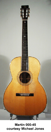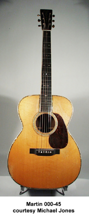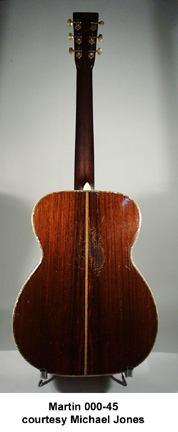 000-45 | - Grand Auditorium body style, solid spruce top, Brazilian rosewood (1907-1942) or Indian rosewood (1970-1985) back and sides, round soundhole with pearl rosette, ivory (1907-1918) or ivoroid (1918-1942, 1970-1985) top and back binding, pearl top borders that go around the fingerboard, zipper-pattern back stripe, cedar (1907-1916) or mahogany (1916-1942, 1970-1985) neck, 12/19-fret (1907-1934) or 14/20-fret (1934-1942, 1970-1985) ivory (1907-1918), ivoroid (1918-1942), or white (1970-1985)-bound ebony fingerboard with pearl diamond/snowflake inlays (1907-1942) or hexagaonal inlays (1970-1985), ivory (1907-1918), ivoroid (1918-1942), or white (1970-1985)-bound slotted (1907-1934) or solid (1934-1942, 1970-1985) headstock with rosewood overlay and torch inlay (1907-1934) or vertical block Martin logo (1934-1942, 1970-1985), three-per-side silver tuners with pearl buttons (1907-1934) or regular tuners (1934-1942, 1970-1985), ivory (1907-1918) or ebony (1918-1942, 1970-1985) bridge, black bridge pins with pearl dots, no pickguard (1907-1932), tortoise pickguard (1932-1942), or black pickguard (1970-1985), available in Natural finish, 24.9 in. scale, total production of 327 instruments, mfg. 1907-1942, 1970-1985. |