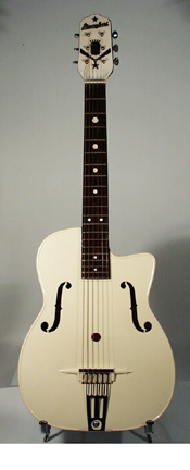G-40 ARCHTOP | - single cutaway hollow archtop plastic body, f-holes, neck-thru body, 20-fret fingerboard with large white dot inlays, elaborate tailpiece, three-per-side banjo-style tuners, available in White finish, mfg. 1953-mid 1950s. |