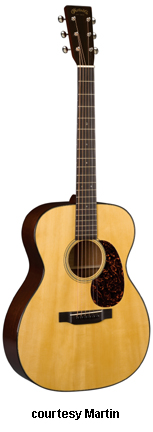OM-18GE GOLDEN ERA | - orchestra body style based on a 1930 14-fret OM-18, solid Adirondack spruce top, solid mahogany back and sides, standard X scalloped bracing, round soundhole with old Style 18 three-stripe black/white fiber rosette (1/5/1 grouping), Brazilian rosewood binding, multiple black/maple/black fiber top inlay, 30s-style V select hardwood neck, 14/20-fret ebony fingerboard with abalone dot inlays at the 5th, 7th, and 9th frets, solid Brazilian rosewood headstock overlay with no logo, three-per-side Waverly nickel banjo-style tuners with ivoroid buttons, ebony 1930s-style belly bridge with long saddle, ebony bridge pins, tortoise beveled pickguard, Natural polished gloss finish with Aging Toner top, 25.4 in. scale, case included, mfg. 2003-present. |