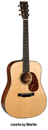 D-18GE GOLDEN ERA (SECOND VERSION) | - dreadnought body style based on a 1934 14-fret D-18, solid Adirondack spruce top, solid mahogany back and sides, standard X scalloped forward shifted bracing, round soundhole with old Style 18 three-stripe rosette (1/9/1 grouping), black boltaron binding, multiple B/W boltaron top inlay, select hardwood neck, 14/20-fret ebony fingerboard with old Style 18 dot inlays, solid Brazilian rosewood headstock overlay with Golden Era-style logo, three-per-side Waverly nickel tuners with Butterbean buttons, ebony 1930s-style belly bridge with long saddle, black bridge pins, tortoise beveled pickguard, Natural or Sunburst (summer 2005-present) polished gloss finish with Aging Toner top, 25.4 in. scale, case included, mfg. summer 1999-present. |