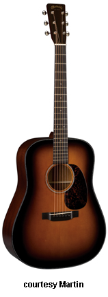 000-18 AUTHENTIC 1937 | - Grand Auditorium body style based on a 1937 14-fret 000-18, solid Adirondack spruce top, solid mahogany back and sides, standard X scalloped forward shifted bracing, round soundhole with old Style 18 three-stripe rosette (1/9/1 grouping), tortoise color binding, multiple B/W Boltaron top inlay, solid Brazilian rosewood back stripe, authentic 1937 Barrel & Heel mahogany neck, 14/20-fret ebony fingerboard with old Style 18 dot inlays, solid Brazilian rosewood headstock overlay with Golden Era-style logo, three-per-side Waverly nickel tuners with oval buttons, ebony 1930s-style belly bridge with long saddle, ebony bridge pins, Delmar tortoise beveled pickguard, available in Natural or Sunburst polished gloss finish with Aging Toner top, 24.9 in. scale, authentic-style case included, mfg. 2008-present. |