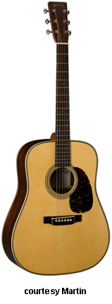 D-28 AUTHENTIC 1937 | - dreadnought body style based on a 1937 14-fret D-28, solid Adirondack spruce top, solid Brazilian rosewood back and sides, standard X scalloped forward shifted bracing, round soundhole with Style 28 three-stripe rosette (5/9/5 grouping), grained ivoroid binding, fine herringbone top inlay, B/W boltaron back inlay, HD zig-zag back stripe, mahogany neck, 14/20-fret ebony fingerboard with long pattern diamond and square inlays, solid Brazilian rosewood headstock overlay with Golden Era-style logo, three-per-side Gotoh nickel open-geared tuners with Butterbean buttons, ebony 1930s-style belly bridge with long saddle, antique white bridge pins with black dots, Delmar tortoise color beveled pickguard, available in Natural polished gloss finish with Aging Toner top, 25.4 in. scale, authentic-style case included, mfg. 2007-present. |
