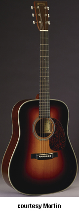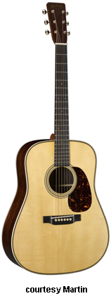 D-28 MUSEUM EDITION 1941 | - dreadnought body style based on the 1941 14-fret D-28 (serial number 79103) that is on display in the Martin Museum, solid Adirondack spruce top, solid Madagascar rosewood back and sides, standard X scalloped authentic-style bracing, round soundhole with Style 28 three-stripe rosette (5/9/5 grouping), grained ivoroid binding, bold herringbone top inlay, B/W boltaron back inlay, HD zig-zag back stripe, authentic 1941 barrel and heel mahogany neck, 14/20-fret ebony fingerboard with long pattern diamond and square inlays, solid Madagascar rosewood headstock overlay with Golden Era-style logo, three-per-side Waverly nickel tuners with oval buttons, ebony 1930s-style belly bridge with long saddle, antique white bridge pins with black dots, Delmar tortoise color beveled pickguard, available in Natural polished gloss finish with Aging Toner top, 25.4 in. scale, Harptone case included, new 2009. |