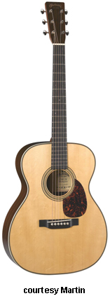 OM-28GE GOLDEN ERA | - orchestra body style based on a 1930s 14-fret OM-28, solid Adirondack spruce top, solid Brazilian rosewood back and sides, scalloped bracing, round soundhole with old Style 28 black/maple three-stripe rosette (5/9/5 grouping), grained ivoroid binding, fine herringbone top inlay, 30s-style modified V select hardwood neck, 14/20-fret ebony fingerboard with short pattern diamond and square inlays, solid Brazilian rosewood headstock overlay with Golden Era-style logo, three-per-side Gotoh nickel open-geared tuners with Butterbean buttons, ebony 1930s-style belly bridge with long saddle, fossilized ivory bridge pins with black dots, tortoise pickguard, Natural polished gloss finish with Aging Toner top, 25.4 in. scale, case included, mfg. summer 2003-mid-2006. |