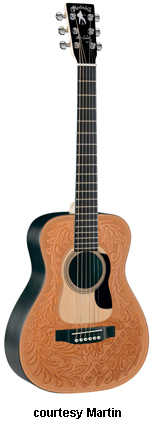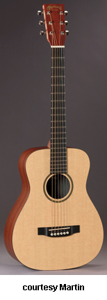 MARTIN | ACOUSTIC: LITTLE MARTIN (LX) SERIES | The Little Martin Series are constructed out of the same High Pressure Laminate (HPL) that is used on Martin's X Series. The Little Martin (LX) Series are much smaller than regular Martin's and are targeted for travel, recreation, student use, or beginners. The overall length of the LX is 34 in. compared to 40.5 in. for a regular Martin dreadnought and scale size is 23 in. compared to 25.4 in. Every LX guitar has the same small body shape, but Martin has made several colors and features available. The first LX model was introduced in summer 2003, and the continue to produce all models that have been introduced. | LXM LITTLE MARTIN | - downsized 0 body style, HPL textured spruce patterned top, HPL textured mahogany pattern back and sides, gold and black herringbone-style rosette, rust Stratabond neck, 14/20-fret East Indian rosewood fingerboard, HPL mahogany pattern headstock overlay, three-per-side chrome tuners with small buttons, East Indian rosewood fingerboard, no pickguard, available in Natural semi-gloss finish, 23 in. scale, padded gig bag included, mfg. summer 2003-present. |
