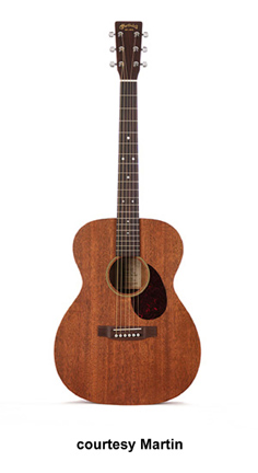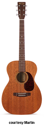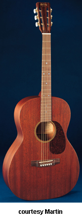 000-15 | - 000 body style, solid mahogany or solid sapele (2003-present) top, back, and sides, round soundhole with gold and black Herringbone rosette, select hardwood neck, 14/20-fret rosewood fingerboard with Style 28 dot inlays, solid rosewood headstock overlay with raised gold foil logo, three-per-side chrome tuners with small buttons, rosewood bridge, tortoise color pickguard, available in Natural Satin finish, 25.4 in. scale, mfg. summer 1998-present. |