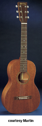 5-15 | - small Size 5 body style, solid mahogany or solid sapele (2003-present) top, back, and sides, round soundhole with gold and black Herringbone rosette, select hardwood neck, 12/18-fret rosewood fingerboard with Style 28 dot inlays, solid rosewood headstock overlay with raised gold foil logo, three-per-side chrome tuners with small buttons, rosewood bridge, available in Natural Satin finish, 21.5 in. scale, mfg. summer 2002-06. |