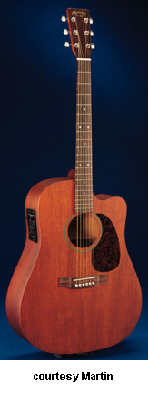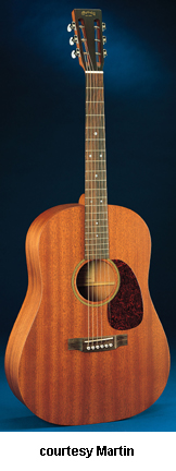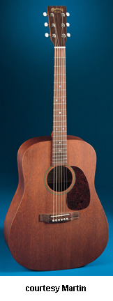 MARTIN | ACOUSTIC: 15 SERIES | Martin's 15 Series feature all solid mahogany or solid sapele top, back, and sides. Because of the lower price of mahogany wood, Martin offers these guitars as a middle-level option. Other features of the 15 Series include no body, fingerboard, or headstock bindings and A-frame bracing. The first 15 Series guitar was the D-15 and it was introduced in 1997. Several other models popped up during the late 1990s and early 2000s including jumbos, orchestras, 00s, and 000s, and the 15 Series continues to be a strong line in Martin's catalog. | D-15 | - dreadnought body style, solid mahogany or solid sapele (2003-present) top, back, and sides, round soundhole with gold and black Herringbone rosette, select hardwood neck, 14/20-fret rosewood fingerboard with Style 28 dot inlays, solid rosewood headstock overlay with raised gold foil logo, three-per-side chrome tuners with small buttons, rosewood bridge, tortoise color pickguard, available in Natural Satin finish, 25.4 in. scale, mfg. 1997-present. |