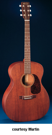 OM-15 | - orchestra body style, solid mahogany top, back, and sides, round soundhole with gold and black Herringbone rosette, select hardwood neck, 14/20-fret rosewood fingerboard with Style 28 dot inlays, solid rosewood headstock overlay with raised gold foil logo, three-per-side chrome tuners with small buttons, rosewood bridge, tortoise color pickguard, available in Natural Satin finish, 25.4 in. scale, mfg. summer 2000-02. |