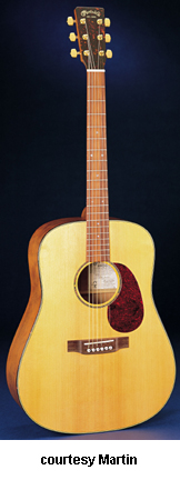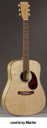 SWD RED BIRCH CERTIFIED WOOD | - dreadnought 14-fret-style body, solid rescued Sitka spruce top, Sustainable solid red birch back and sides, D1 A-frame non-scalloped bracing, round soundhole with single ring rosette (five-ring grouping), tortoise color binding, thin black Style 18 top inlay style, multiple layer black/white Boltaron back inlay, Sustainable cherry neck, 14/20-fret Sustainable Katalox fingerboard with Style 28 pearl dot inlays, Sustainable red birch headstock overlay with gold foil logo, three-per-side gold Gotoh tuners with large knobs, Katalox belly bridge, white bridge pins with black dots, tortoise color pickguard, Natural polished gloss finish with Autumn Maple toner, 25.4 in. scale, case included, mfg. summer 2003-04. |
