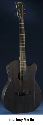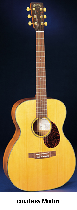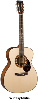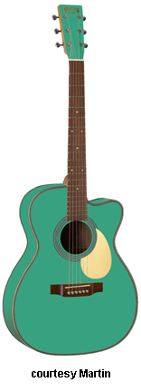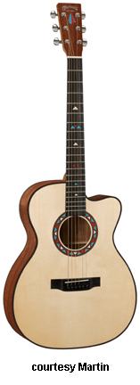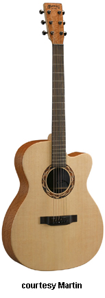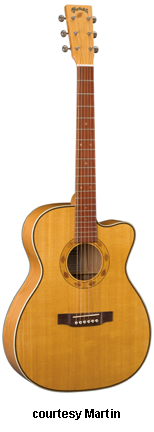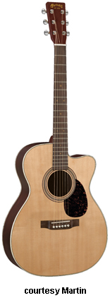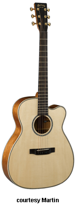 OMC ARTINGER 1 | - single smooth cutaway Orchestra-style body solid Sitka spruce top, solid East Indian rosewood back and sides, elliptical soundhole with laser-cut koa binding that is at an oblique angle, special oval sound port on the lower bass side, figured Hawaiian koa binding, mortise neck, 14/22-fret striped ebony fingerboard with aluminum jogged dot inlays, ebony headstock overlay, three-per-side chrome tuners with ebony buttons, striped ebony bridge, Martin Gold Plus Natural 1 pickup, label signed by Matt Artiger, available in Natural Gloss finish with a triangle beneath the soundhole and black arm bevel on the lower bass bout, 25.4 in. scale, mfg. 2007-present. |