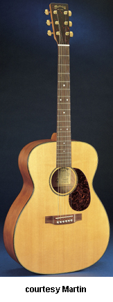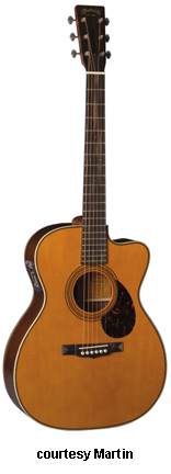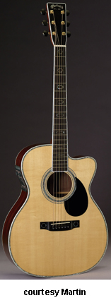 OMC AURA | - single cutaway Grand Auditorium 14-fret 000-style body, solid Sitka spruce top, solid East Indianrosewood back and sides, hybrid X scalloped bracing, round soundhole with three-ring Style 45 rosette (5/9/5 grouping with a large middle ring of abalone pearl, white Boltaron binding, abalone pearl with B/W/B Boltaron top inlay, Style 28 back inlay, B/W Boltaron side inlay, Style 45 back purfling, select hardwood neck, 14/20-fret bound ebony fingerboard with pearl hexagon outline inlays, bound headstock with ebony overlay and MOP logo, three-per-side gold Gotoh tuners with large ebony buttons, ebony belly bridge with pearl hexagon outlines, ebony bridge pins with abalone pearl dots, black beveled pickguard, Fishman Prefix Aura system electronics, Natural polished gloss finish, 25.4 in. scale, mfg. 2004-present. |