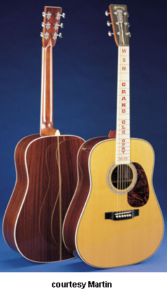 HDO GRAND OLE OPRY (2000) | - dreadnought 14-fret-style body, solid Sitka spruce top, solid East Indian rosewood back and sides, D1 hybrid/scalloped bracing, round soundhole with three-ring Style 45 rosette (5/9/5 grouping with a large middle ring of abalone pearl), grained ivoroid binding, fine herringbone top inlay, B/W Boltaron back inlay, HD zig-zag back purfling, select hardwood neck, 14/20-fret white Micarta fingerboard with red "WSM Grand Ole Opry" and 19th-20th fret "1925-2000" inlays, ebony headstock overlay with abalone pearl WSM microphone inlay and gold foil logo, three-per-side nickel open-geared Gotoh tuners with Butterbean knobs, ebony belly bridge, white bridge pins with tortoise color dots, tortoise beveled pickguard, two labels with one signed by CFM IV and numbered in sequence and one with the Ryman Auditorium, Natural polished gloss finish with Vintage Toner top and Dark Filler back and sides, 25.4 in. scale, case included, limited edition run of 650 instruments, mfg. 2000-04. |