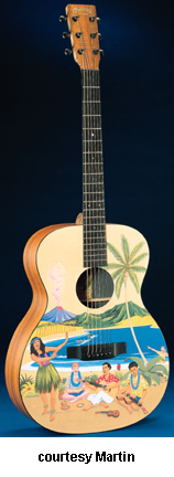 HAWAIIAN X (2002) | - Grand Auditorium 14-fret 000-style body, Hawaiian Luau Custom High Pressure Laminate (HPL) top, koa wood pattern HPL textured back and sides, 000-1 A-frame bracing, round soundhole, brown Stratabond neck, 14/20-fret black Micarta fingerboard with Style 18 abalone pearl dot inlays, koa wood pattern HPL textured headstock overlay with raised gold foil logo, three-per-side black Gotoh tuners with CFM logo, black Micarta belly bridge, label numbered in sequence, custom Hawaiian Luau graphic finish by R. Armstrong, 25.4 in. scale, hardshell case included, limited edition run of 500 instruments, mfg. 2002-05. |