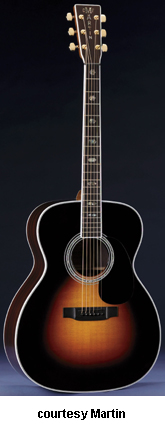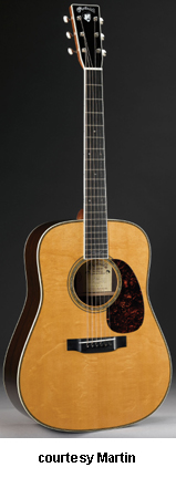 HD-28KM KEVIN MOORE "KEB' MO'" (2001) | - dreadnought 14-fret-style body, solid Englemann spruce top, solid flamed Hawaiian koa back and sides, standard X scalloped forward-shifted bracing, round soundhole with three-ring Style 45 rosette (5/9/5 grouping with large center ring of abalone pearl), grained ivoroid binding, fine herringbone top inlay, B/W/B back and side inlays, HD zig-zag back purfling, mahogany neck, 14/20-fret ebony fingerboard with long pattern abalone pearl diamond and squares inlays and 20th fret Keb' Mo' signature inlay, ebony headstock with old Style logo, three-per-side gold Schaller M6 tuners with large ebony buttons, ebony belly bridge, white bridge pins with tortoise dots, tortoise color pickguard, label signed by CFM IV and Kevin Moore, Natural polished gloss finish with Vintage Toner top, 25.4 in. scale, case included, limited edition run of 250 instruments, mfg. early 2001 only. |