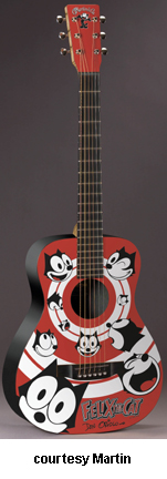 FELIX (2004) | - Little Martin-style body, High Pressure Laminate (HPL) top, Jett Black HPL back and sides, round soundhole, natural Stratabond neck, 14/20-fret black Micarta fingerboard with no inlays, HPL black headstock overlay with Felix The Cat graphic and printed logo, three-per-side chrome tuners with small knobs, black Micarta bridge, available in Red Felix The Cat graphics, 23 in. scale, Felix The Cat gig-bag included, limited edition run of 756 instruments, mfg. 2004 only. |