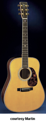 HD-40 TOM PETTY (2004) | - dreadnought 14-fret-style body, solid Italian Alpine spruce top, solid East Indian rosewood back and sides, round soundhole with three-ring Style 45 rosette (5/9/5 grouping with a large middle ring of abalone pearl), grained ivoroid binding, bold herringbone top inlay, multiple B/W back inlay, select hardwood neck, 14/20-fret grained ivoroid/mitered-bound ebony fingerboard with "Phases Of The Moon" motif inlays (new moon at first fret in brown lip pearl, rest in awabi, stars in paua) and 20th fret Tom Petty signature, bound headstock with ebony overlay abalone pearl torch inlays (no logo), three-per-side gold Schaller tuners with large ebony knobs, ebony belly bridge, ebony bridge pins with abalone pearl dots, tortoise pickguard, Fishman Gold Plus Natural II electronics, label signed by CFM IV and Tom Petty and numbered in sequence, Natural polished gloss finish with Vintage Toner top and Dark Filler back and sides, 25.4 in. scale, case included, limited edition run of 274 instruments, mfg. 2004 only. |