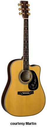 HDC-40 TRAVIS TRITT (2007) | - single cutaway dreadnought 14-fret thin 000-depth-style body, solid Adirondack spruce top, solid East Indian rosewood back and sides, Style 45 herringbone pearl rosette, grained ivoroid binding, bold herringbone top inlay, black/white Boltaron back inlay, mahogany neck, 14/20-fret grained ivoroid bound ebony fingerboard with MOP Vine of Harmonics and Travis Tritt's signature between the 18th and 19th frets inlays, rosewood headstock overlay with "CMF Martin" logo, three-per-side gold tuners with large buttons, ebony bridge with island scroll inlays, black pickguard with vine inlays, label signed by Travis Tritt, available in Natural finish, 25.4 in. scale, limited edition run of 40 instruments, mfg. summer 2007 only. |