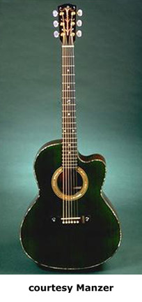 MANZER GUITARS | Instruments currently built in Toronto, Canada since 1974. | Luthier Linda Manzer was first inspired to build stringed instruments after seeing Joni Mitchell perform on a dulcimer in 1969. Manzer began building full time in 1974, and apprenticed under Jean Claude Larrivee until 1978. In 1983, Manzer spent several months with James D'Aquisto while learning the art of archtop guitar building. Manzer gained some industry attention after she completed Pat Metheny's "Pikasso" multi-necked guitar (the model has four necks sharing one common body and 42 strings). In 1990, Manzer was commissioned by the Canadian Museum of Civilization to create a guitar for one of their displays. In addition to building the high quality guitar that she is known for, Manzer included inlay designs in the shape of one of Canada's endangered species on the neck. The extra ornamentation served as a reminder for environmental concerns. Noted players using Manzer guitars include Pat Metheny, Bruce Cockburn, and Carlos Santana. For more information visit Manzer's website or contact her directly (see Trademark Index). | | ACOUSTIC: ARCHTOP SERIES | ACOUSTIC: FLATTOP SERIES |