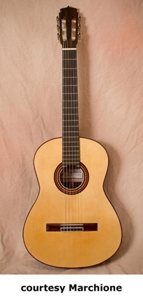 MARCHIONE GUITARS | Instruments currently handcrafted in Houston, TX. Previously built in New York (Manhattan), NY, since 1993. | Stephen Marchione builds recording quality archtop and special commission guitars. Marchione's clientele primarily consists of New York's top studio and stage players, and he has received commissions from the likes of Mark Whitfield, John Abercrombie, Vernon Reed, and Mark Knofler. Other notables playing Marchione's guitars are George Wadenius (Steely Dan's Alive in America CD), Mark Stewart (Bang on a Can's Music for Airports CD), and Kenny Brescia and Ira Seigel (sound track for the Broadway smash Rent). Marchione approaches his craft from many different angles. He understands players' sound and comfort needs as a guitar player himself. Marchione also seriously studies the great guitar and violin instruments in order to build archtop guitars that function as pinnacle pieces. When a player brings in a D'Aquisto or D'Angelico to Marchione's Manhattan shop, Marchione scrutinizes the instrument's construction, draws blueprints, and then quizzes the player about the instrument's best qualities. These important elements are then incorporated into his own designs. The violin tradition has also figured prominently in Marchione's building. A hands-on understanding of cello arching is crucial to Marchione's ability to recreate the arching subtleties that imbue his archtop guitars with full acoustic volume and tambour. Marchione's friendship with violin maker Guy Rabut has impressed upon Marchione the importance of incorporating centuries of stringed instrument knowledge. Their friendship has also given Marchione the opportunity to measure and draw plans from Guarnieri cellows as well as Rabut's renowned instruments. Personal musicianship, an exacting approach to guitar making, and the experience of hand building almost three hundred acoustic archtops, neck-throughs, and electric guitars are the groundwork for each and every Marchione guitar. Company information courtesy Stephanie Green. | | ACOUSTIC ARCHTOP MODELS |