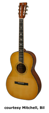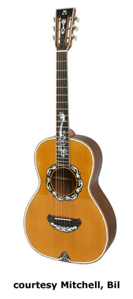 MITCHELL, BIL GUITARS | Instruments currently built in Bucks County, PA, since 1979. Previously located in Wall, NJ, Mitchell relocated and expanded his shop to Riegelsville, PA in 2003. | Bil Mitchell has been designing and crafting high-end acoustic and electric guitars since 1979. Bil's longevity as a full-time luthier has firmly established him as a consummate craftsman focusing primarily on flat top acoustic guitars. He and his partner Sarah Dieterichs operate the Guitar Parlor, offering custom guitars, extensive repairs, and a retail showroom. Bil Mitchell has no affiliation with the import line of "Mitchell" guitars. His early logo is displayed as Mitchell on the headstock, but every acoustic guitar built since 1995 displays an "M" logo and sound hole label marked "Bil Mitchell". A number of acoustic basses, archtop, solid bodies, and hybrid guitars were also manufactured. Call Bil Mitchell directly to identify. For more information, contact Bil Mitchell directly (see Trademark Index). | | ACOUSTIC |