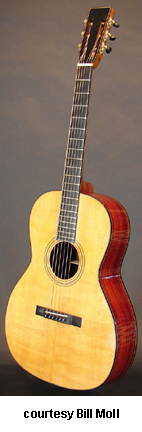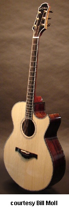 MOLL CUSTOM INSTRUMENTS | Instruments currently built in Springfield, MO, since 1996. | Luthier Bill Moll builds premium custom crafted acoustic flattops and and acoustic and electric archtop guitars. Moll instruments are designed and built to perform acoustically before any electronics are considered. Much of Moll's training comes from his years in the violin business, and several construction aspects of his guitars reflect this. Moll's wife Denise has been studying lutherie since 1997 and continues to help in the shop. For more information, visit Moll's website or contact him directly (see Trademark Index). | | ACOUSTIC |