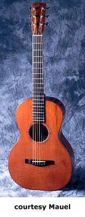 MAUEL GUITARS | Instruments currently produced in Auburn, CA since 1995. | Luthier Hank Mauel builds high-quality acoustic guitars out of the highest quality traditional tonewoods in a variety of styles. Model styles include the OM, Deep Bodied OM, 0, 00, 000, 12-fret, 12-fret dreadnought, dreadnought, grand auditorium, grand concert, parlor, and small jumbo. As of April, 2007, Mauel is back to building instruments full-time as he temporarly cut back his production for 2006 and part of 2007. For further information, contact Mauel directly (see Trademark Index). | |