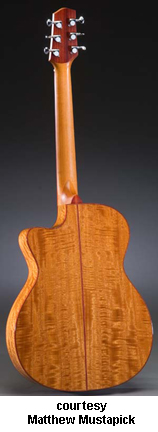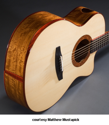 MATTHEW MUSTAPICK GUITARS | Instruments currently produced in Soquel, CA since 2003. | Luthier Matthew Mustapick began building guitars in 2003 after leaving his job at an Internet company in the heart of Silicone Valley. Mustapick learned the art of building guitars through talking with other builders, reading books and literature, researching the Internet, and playing guitars to find out as much about them as he could. He offers five main models with the Aurora, Arena OM, Classical, Concert Nylon Crossover, and the Deep Baritone. Mustapick also offers several options and because each guitar is hand built, each model can be custom ordered. Mustapick uses several features that have become more popular in 21st century playing such as the Kevin Ryan-style body bevel, the Linda Manzer-style wedge body, and multi-scale designs. Prices start at $5,100 for the Aurora and Arena OM, $5,200 for the Deep Baritone, and $5,300 for the Classical and Concert Nylon Crossover. For more information, visit Mustapick's website or contact him directly (see Trademark Index). | |