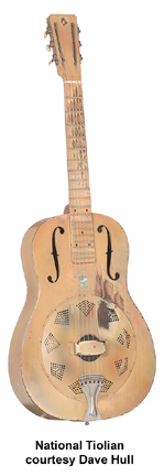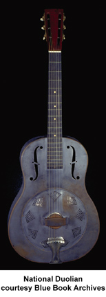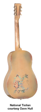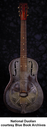 NATIONAL | ACOUSTIC: SINGLE CONE MODELS | | STYLE O | - nickel plated bell brass body, 2 f-holes, maple neck, 12/19-fret ebonized maple fingerboard with pearl dot inlay, 3-per-side tuners, available with Sandblasted Hawaiian Scene on body, mfg. 1930-1941. |