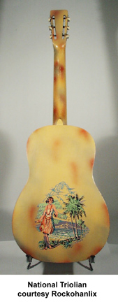 TRIOLIAN | - wooden body, 2 flat cut f-holes, 12/19-fret fingerboard, available in Light Green finish with a light overspray of several colors; neck, fingerboard, and peghead featured matching finish, decals were then placed on the body; early models feature a bouquet design, later models feature a hula girl design, mfg. 1928-1941. |