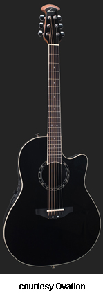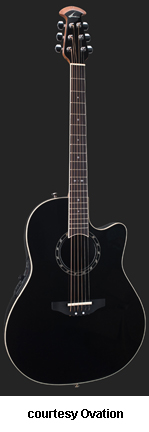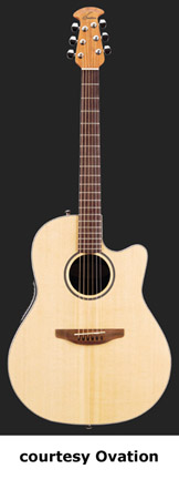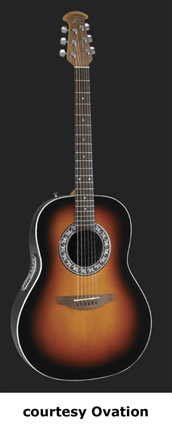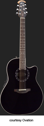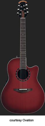 STANDARD BALLADEER (MODEL 1771AX) | - single cutaway mid-depth body, AA solid spruce top, scalloped X bracing, round soundhole with hand-inlaid rosette, multi-ply body binding, five-piece satin finish mahogany/maple neck, 14/20-fret bound rosewood fingerboard with pearl dot and diamond inlays, black headstock overlay with Ovation logo, three-per-side chrome tuners, rosewood bridge, OCP-1 pickup, OP-Pro electronics, available in Black or Cherry Cherry Burst finish, 25.25 in. scale, mfg. summer 2008-present. |