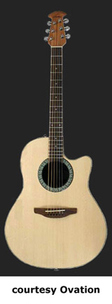 STANDARD BALLADEER CONTOUR CUTAWAY LX (MODEL 2771LX) | - single cutaway deep body with a contoured back, solid Sitka spruce top, Scalloped LX bracing, round soundhole with oakleaf rosette, bound rosewood fingerboard with dot/diamond inlays, standard Ovation headstock, three-per-side chrome tuners, rosewood bridge, original patented pickup, available in Black, Cherry Cherry Burst, or Natural finish, 25.25 in. scale, new 2008. |