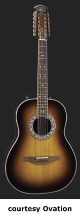 GLEN CAMPBELL 12-STRING 40TH ANNIVERSARY (MODEL 1618) | - 12-string configuration, Balladeer style, non-cutaway hand-made fiberglass cloth roundback body, solid Sitka spruce top, Ovation VT-12 bracing, round soundhole with oak leaf rosette, 12/18-fret ebony fingerboard with diamond and dot inlays, six-per-side Schaller open-style gold tuners with pearl buttons, truss rod cover with Glen Campbell signature, walnut bridge, original patented pickup, FET electronics, available in Sunburst finish, 25.25 in. scale, mfg. 2006 only. |