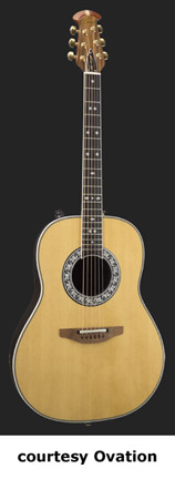 GLEN CAMPBELL 40TH ANNIVERSARY (MODEL 1627) | - non-cutaway hand-made fiberglass cloth roundback body, solid Sitka spruce top, Ovation A bracing, round soundhole with oak leaf rosette, 14/20-fret ebony fingerboard with diamond and dot inlays, three-per-side Schaller gold tuners, truss rod cover with Glen Campbell signature, walnut bridge, original patented pickup, FET electronics, available in Natural finish, 25.25 in. scale, mfg. 2006 only. |