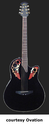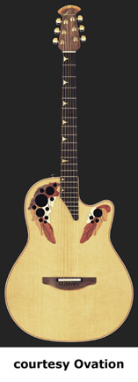 OVATION | ACOUSTIC: LONGNECK SERIES | | LONGNECK (MODEL DS 768) | - similar to the Elite model six string, except has a scale length of 28 1/3 in. and is tuned one full step lower than a standard guitar, five-piece maple and mahogany neck, gold-plated hardware, and OP-X preamp, available in Natural or Cherry Cherryburst finishes, mfg. 1994-99. |