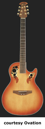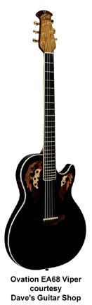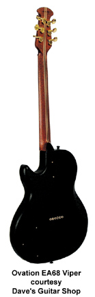 OVATION | ACOUSTIC: VIPER SERIES | The Viper was originally a solid body guitar from the mid-1970s to the early 1980s. The Viper name has now been affixed to a new, 1990s acoustic/electric slim body design. The Viper model has a solid Spruce top, and a mahogany body with acoustic chambers. An onboard active electronics package (volume and three band EQ) allows control over feedback. | VIPER (MODEL EA68) | - single cutaway mahogany body with routed sound chamber, bound spruce top, 14 multi-size soundholes with various leaf wood overlay, five-piece mahogany/maple neck, 24-fret bound ebony fingerboard, strings through rosewood bridge, rosewood veneered peghead with screened logo, three-per-side gold tuners, six piezo bridge pickups, volume/3-band EQ controls, available in Black or Natural finish, mfg. 1994-2008. |