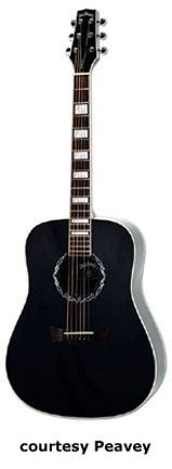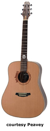 PEAVEY | ACOUSTIC: MISC. MODELS | | JACK DANIEL'S JDAG1 | - dreadnought style, spruce top, rosewood back and sides, round soundhole with white filigree rosette, 14/20-fret rosewood fingerboard with pearl block inlay, Jack Daniel's on headstock with three-per-side tuners, Piezo pickup under bridge, chrome hardware, available in Black finish, mfg. 2005-present. |