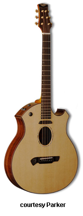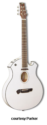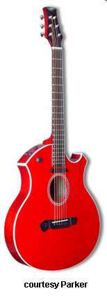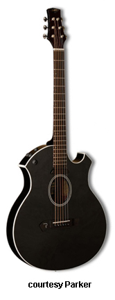 P6E | - single cutaway uniquely-shaped body, solid Sitka spruce top, mahogany back and sides, oval soundhole with pearl ring rosette, black or white body binding, set mahogany neck, 14/19-fret ebony fingerboard with offset microdot inlays, three-per-side gold tuners, ebony bridge with "P" inlay, Fishman hum-cancelling exposed pickup and Fishman Acoustic Matrix undersaddle pickup, four knobs (top-mounted v, side-mounted blend, b, t), available in Black, Pearl White, or Trans. Red finish, 25.5 in. scale, mfg. 2006-07. |
