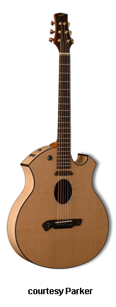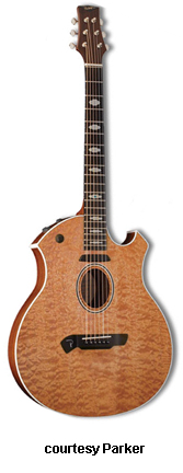 P10E | - single cutaway uniquely-shaped body, solid Sitka spruce top top, bird's-eye maple back and sides, oval soundhole with ring rosette, red tortoiseshell body binding, set mahogany neck, 14/19-fret ivoroid fingerboard with large offset microdot inlays, flame maple headstock overlay with three-per-side gold tuners, ivoroid bridge with "P" inlay, Fishman hum-cancelling exposed pickup and Fishman Acoustic Matrix undersaddle pickup, four knobs (top-mounted v, side-mounted blend, b, t), available in Natural finish, 25.5 in. scale, mfg. 2007-present. |