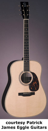 PATRICK JAMES EGGLE GUITARS | Instruments currently built in Summervill, SC. Previously produced in Bedforshire, England and Hendersonville, NC. | Patrick James Eggle produces high quality acoustic and archtop instruments. Eggle started building guitars in the late 1970s. He spent much of the 1980s building and repairing guitars. In the early 1990s, he started building solidbody guitars under the name Patrick Eggle Guitars. In 1995, he left the company in pursuit to work alone. He spent the next few years doing repairs and building various instruments. In 2001, he started to build guitars again, but this time they were acoustic configurations. He worked in Bedforshire, England for a while until he moved to the U.S. Flattop and archtop guitars are currently produced in Hendersonville, NC. For more information, contact Eggle directly (see Trademark Index).