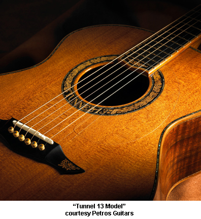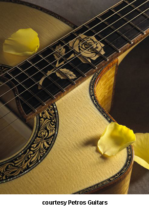 PETROS GUITARS | Instruments currently built in Kaukauna, WI since 1972. | Father and son luthiers Bruce and Matt Petros build about thirty hand-built guitars a year. They offer four body styles with the FS (Finger Style), the GC (Grand Concert) the D (Dreadnought), and the GS (Grand Stadium), which is a Jumbo body used for their largest guitar as well as their baritone. They also build a 12-fret slot-head FS, a 12-fret 12-string GC, and have recently introduce a nylon crossover. All body styles are available with an optional cutaway. Petros Guitars is also the manufacturer/distributor of Petros Professional Instrument care products that includes Professional Instrument Polish, Professional Finish Restorer, and Professional Finger Board Oil. For more information please refer to their website or contact them directly (see Trademark Index). | | ACOUSTIC |
