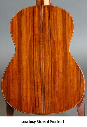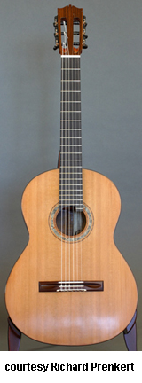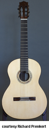PRENKERT, RICHARD | Instruments currently built in near Sebastopol, CA since 1979. | Luthier Richard Prenkert builds high quality classical guitars in his shop near Sebastopol, CA. Prenkert graduated with a Bachelor of Arts degree in music from Sonoma State University in California, and has studied with George Sakellarion, Philip Rosheger, and Richard Stover. Prenkert began building guitars in 1979 when he co-owned a music shop in Santa Rosa, CA. Prekert classical guitars start at $6,000 and are available in a variety of high-quality tonewoods. Waiting time for delivery on a guitar is currently about five months, and Prenkert builds between fifteen and twenty guitars a year. For more information visit Prenkert's website or contact him directly (see Trademark Index). | |