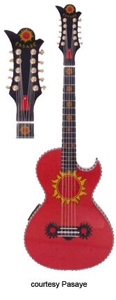 PASAYE | Instruments currently produced in San Diego, CA. Distributed by Golden Hill Music. | Pasaye guitars are produced by Guitarras De Las Americas guitars, and their company name comes from the Central and South America theme of the guitars. These guitars are entirely hand built and they are although they look like normal 12-string guitars they actually Mexican folk guitars that are used in playing Norteno, Cajunto, Tejano, and Tex-Mex styles of music. They also have a full custom shop that can build just about anything. For more information, visit their website or contact them directly (see Trademark Index). | |