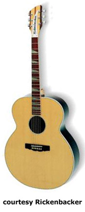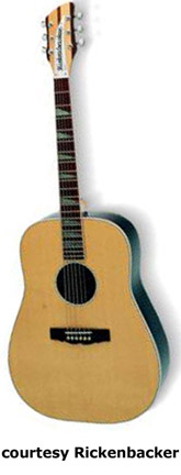 RICKENBACKER | ACOUSTIC | Rickenbacker currently offers the 5002V58 Mandolin, a vintage-style solid body electric mandolin based on a similar model issued in 1958. The current reproduction has a maple and walnut laminated body, eight-string configuration, and single coil pickups. Available in Fireglo or Mapleglo finishes (retail list is $1,619). All current production acoustic models come with a standard case. | 385 | - dreadnought style, maple top, round soundhole, pickguard, checkered body/rosette, maple back/sides/neck, 21-fret rosewood fingerboard with pearl triangle inlay, rosewood bridge with white pins, available in Burst finishes, mfg. 1958-1972. |