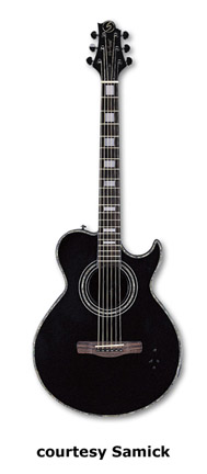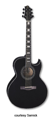 SAMICK | ACOUSTIC: BLACKBIRD SERIES | | SMJ 17 CE | - single sharp thin medium jumbo solid body, solid spruce top, maple sides and back, rosewood fingerboard with block inlays, abalone and black binding, three-per-side black Grover tuners, Fishman Classic 4-Band EQ, available in Black finish, mfg. 2006-present. |