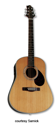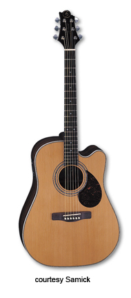 SAMICK | ACOUSTIC: CAROLINA SERIES | | D 14 CE | - dreadnought single cutaway body, solid cedar top, rosewood back and sides, herringbone trim, tortoise pickguard, electronics, three-per-side chrome Grover tuners, available in Natural finish, mfg. 2000-present. |