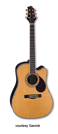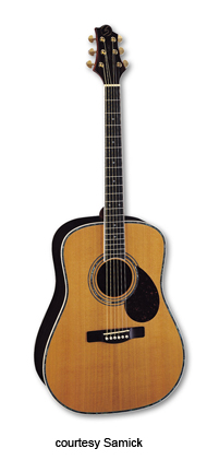 SAMICK | ACOUSTIC: CONTINENTAL SERIES | | D 8 | - dreadnought style body, solid cedar top, rosewood sides and back, abalone trim, tortoise pickguard, three-per-side Grover tuners, gold hardware, available in Natural finish, mfg. 2001-present. |