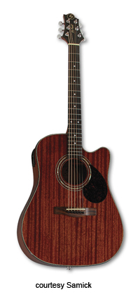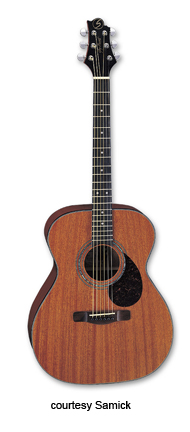 SAMICK | ACOUSTIC: KENSINGTON SERIES | | D 3 | - dreadnought style body, striped mahogany back, top, and sides, six-ply reverse binding, 14/20-fret rosewood fingerboard with dot inlays, pickguard, three-per-side tuners, available in Natural or Wine Red finish, mfg. 2001-present. |