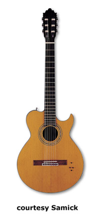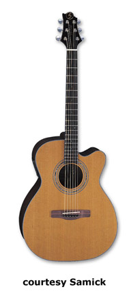 SAMICK | ACOUSTIC: REMINGTON SERIES | | MJ 13 CE | - single cutaway medium jumbo body, solid cedar top, striped mahogany back and sides, 6-ply reverse black binding, 3-per-side Grover chrome tuners, Fishman Classic 4-band EQ, available in Natural finish, mfg. 2000-03. |